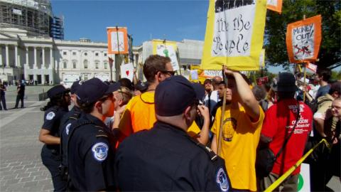 One break the cops caught at Democracy Awakening was this: due to much of the crowd being new to protests, police were able to push crowds back with relatively small forces. The police line that pushed back the support people was only one cop thick. These same protesters after a year of experience might easily break through such weak police lines. The skirmish line used today would not have been able to stop a 100 person Occupy contingent from charging straight through it, and back in 2007, a mixed SDS and anarchist contingent pushed the US Capitol police as a whole from 3ed st all the way to the top of the Capitol steps. That kind of capability comes from experience and training, and always begins with exactly the sort of thing that the first Occupy protests and Democracy Spring represent.