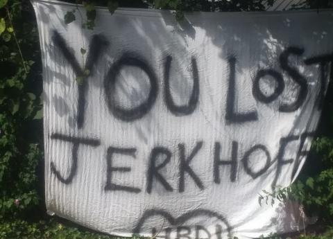 Earlier today, a few of our comrades paid a visit to your idyllic suburban home on W Braddock Rd in Alexandria, VA. They tied a banner reading “YOU LOST JERKHOFF HBD!❤️” across the street from your house. We hope our act of modest pettiness, while it might pale in comparison to yours, can bring some small measure of joy to our freed comrades.